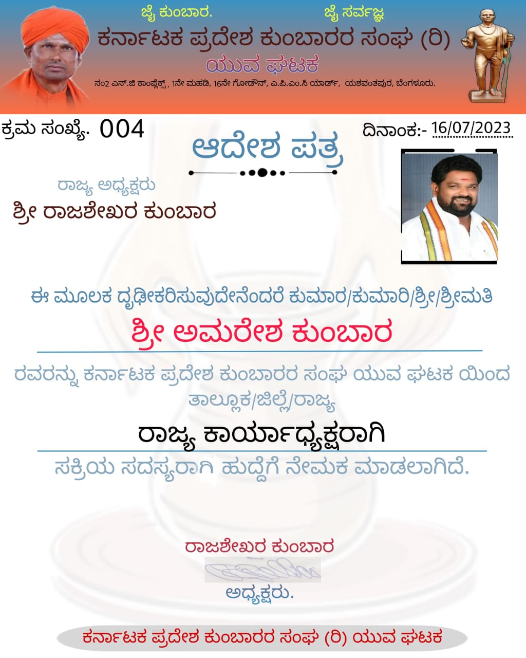 ಈ ಕುರಿತು ರಾಜ್ಯ ಕುಂಬಾರ ಸಂಘ ಯುವಘಟಕದ ರಾಜ್ಯಾಧ್ಯಕ್ಷರಾದ ರಾಜಶೇಖರ ಕುಂಬಾರ ಆದೇಶ ಪತ್ರ ನೀಡಿ, ಹಿಂದುಳಿದ ಕುಂಬಾರ ಸಮಾಜದ ಶ್ರೇಯೋ ಅಭಿವೃದ್ಧಿ ಗಾಗಿ ಉತ್ತಮ ಕಾರ್ಯನಿರ್ವಹಿಸಿ ಸಮಾಜದ ಏಳಿಗೆಗಾಗಿ ಶ್ರಮಿಸಬೇಕೆಂದು ಆದೇಶ ಪತ್ರದಲ್ಲಿ ತಿಳಿಸಿದ್ದಾರೆ.